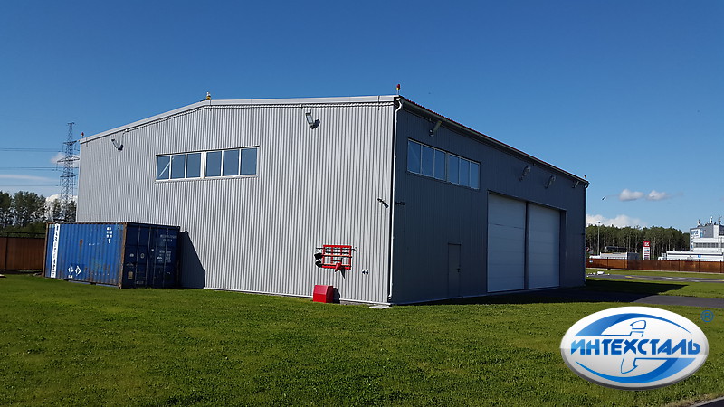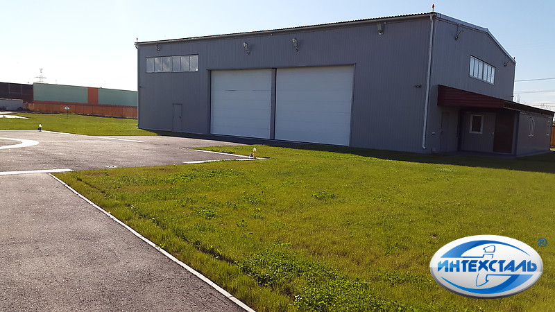Строительство ангаров под ключ для паркинга вертолётов, всего нами построено три строения этой модели для фирмы владельца парка вертолётов в Санкт-Петербурге. цена ангара под ключ - закажи расчёт! Размер каждого здания 18х24 метра, высота до несущих металлических конструкций 5,5 метра, высота подъёмных ворот - 4,5 метра, этих параметров достаточно для того чтобы оперативно закатить или выкатить вертолёт и подготовить его к запуску. Ворота которые мы смонтировали в этом ангаре отличаются дешёвой ценой, при сохранении всех необходимых требований к ним - полезная ширина - 12 метров. При строительстве металлического здания под ключ также была изготовлена взлётно-посадочная площадка и рулёжная дорожка перед ангаром.